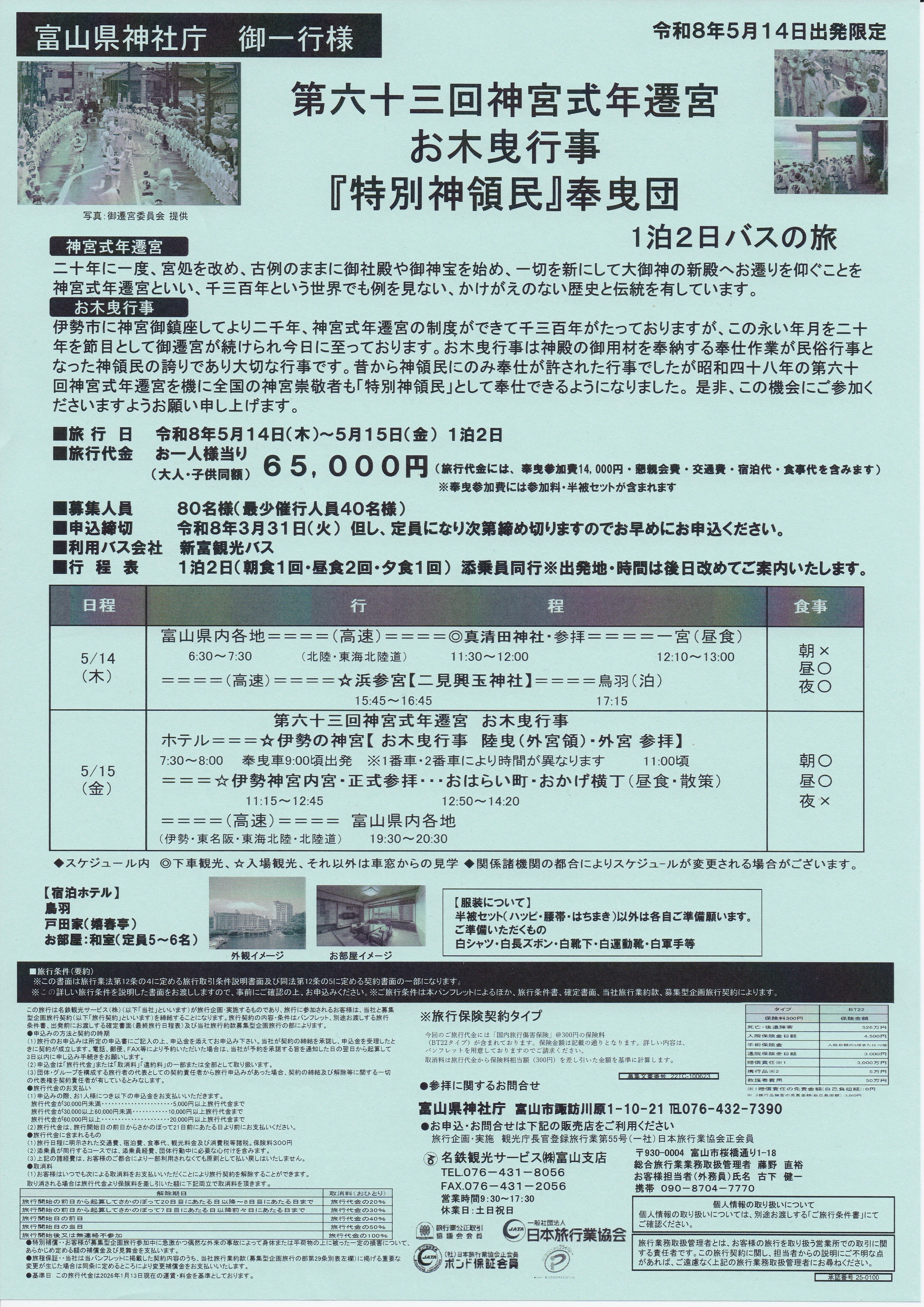 杉原神社ならびに当社兼務神社の氏子の皆様に向けてのお知らせです。今年、伊勢の神宮で行われる「お木曳き行事」に奉曳団として参加させていただくご旅行のご案内です。当社氏子以外の方は、ご自身の氏神神社の神職にお尋ねください。